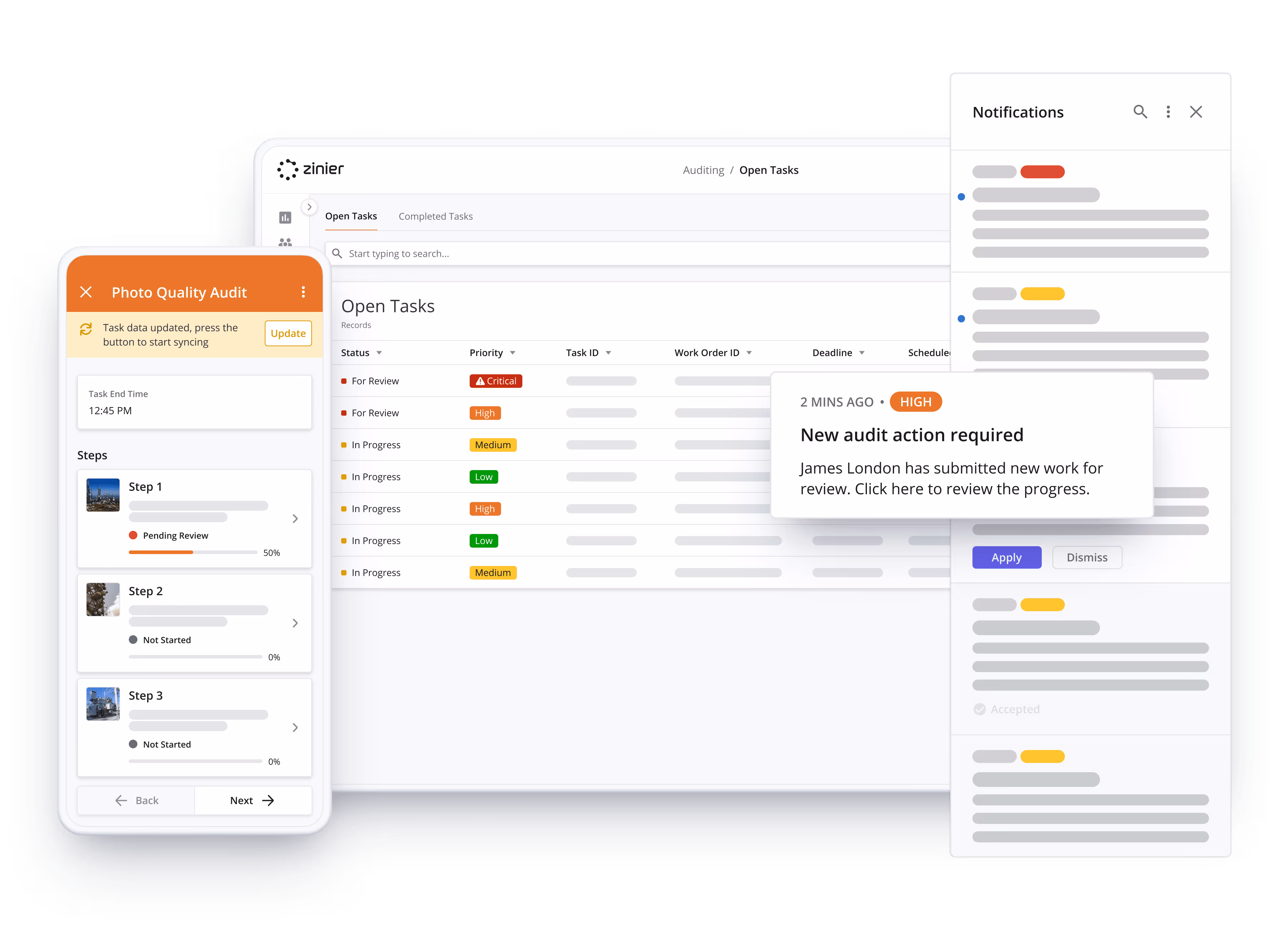 With Zinier’s no-code Task Builder, whenever you decide to modify your audit workflows – perhaps reflecting changes in what needs to be approved/rejected – you can implement those changes in real time without writing a line of code, whenever your business requirements change.